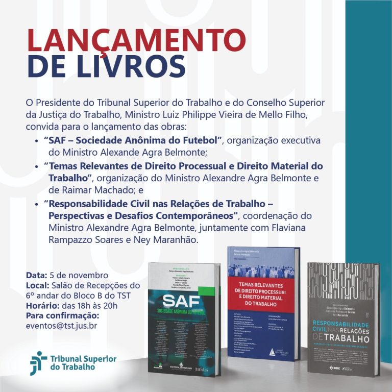 - O quê: Lançamento dos livros “SAF – Sociedade Anônima do Futebol”, “Temas Relevantes de Direito Processual e Direito Material do Trabalho” e “Responsabilidade Civil nas Relações de Trabalho”.